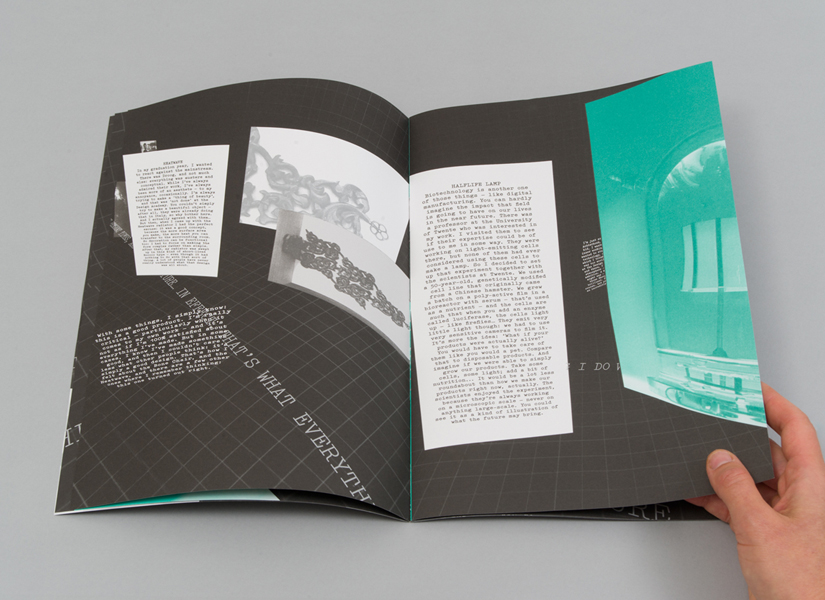 space:As Laarman deals with emerging technologies his work is often ‘futuristic’. After trying to render a 3 dimensional space in a computer program, Niessen & de Vries came up with the idea of setting up a ‘real’ space through which the camera could travel from the past to the future. The captured images are used to form the pages in the booklet. |