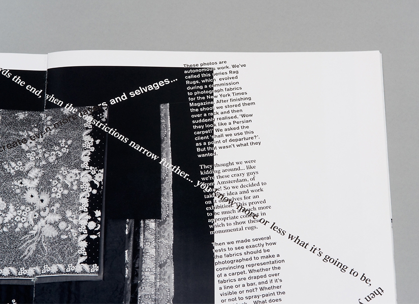 The general text about the work of S&A are set in a single column, but arranged in a way that the fraying form of the text is refering to the shreds of the fabrics in the photographs...