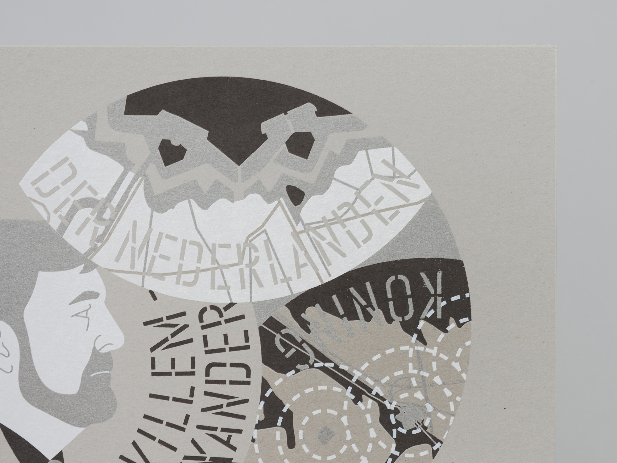 levels:My starting point was to depict the versatility of the defence line. Also, the front and back of the coin are connected in terms of content, and the portrait of King Willem-Alexander is an integral part of the concept. I constructed the coin from concentric circles, each of which shows a different scale level of the 'Hollandse Waterlinies': from the human scale with the portrait of the king, via the map of a fort to the larger connections of inundation columns and ends in an overview. |