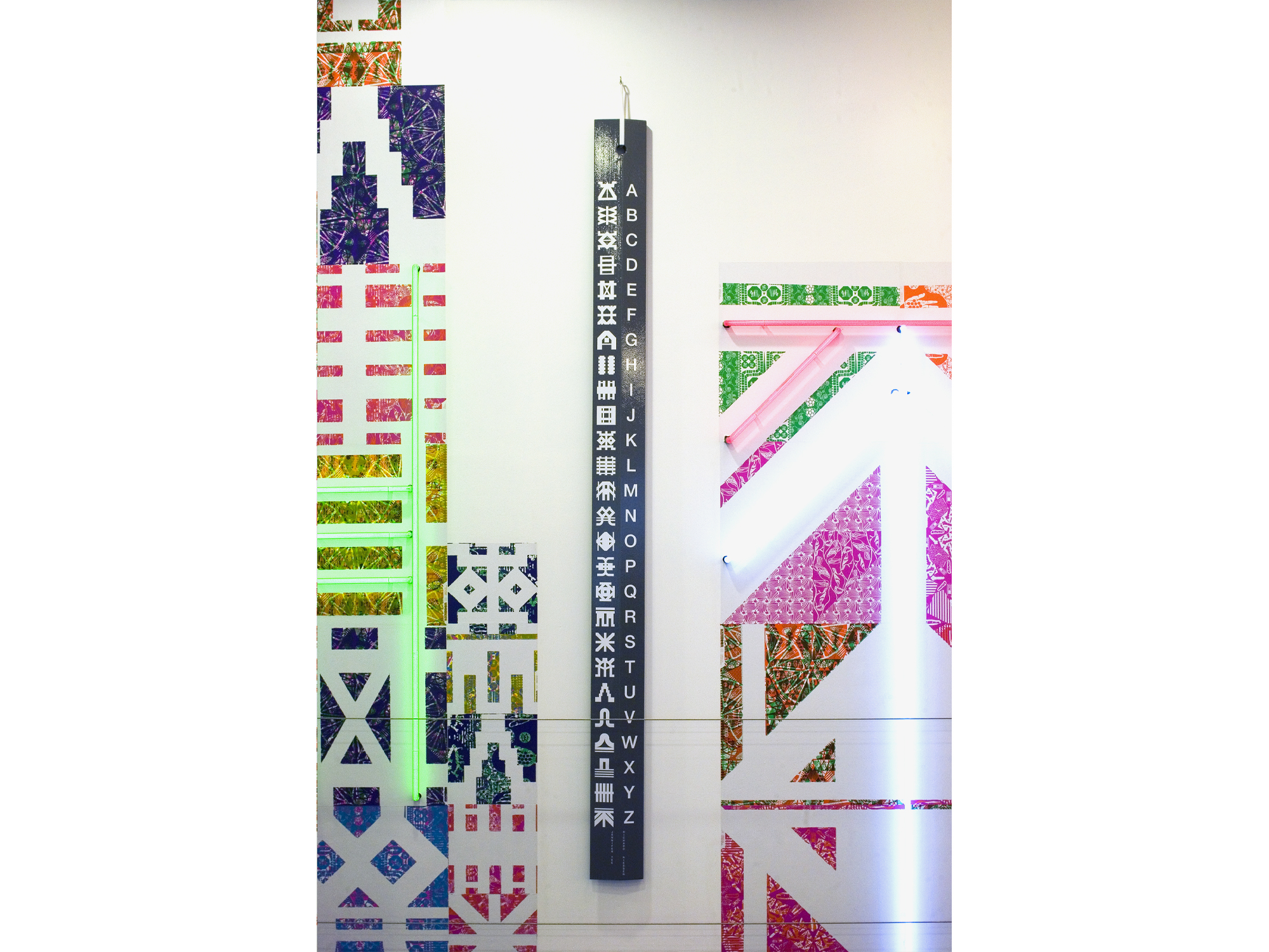 | language:The typeface created resembles a code that can be deciphered using the key integrated into the mural. The code spells out key buildings around the area such as “IKEA” and “ARENA”, in a vertical formation. Elements of the type forms originate from architectural features taken from various buildings and styles observed in buildings globally. |