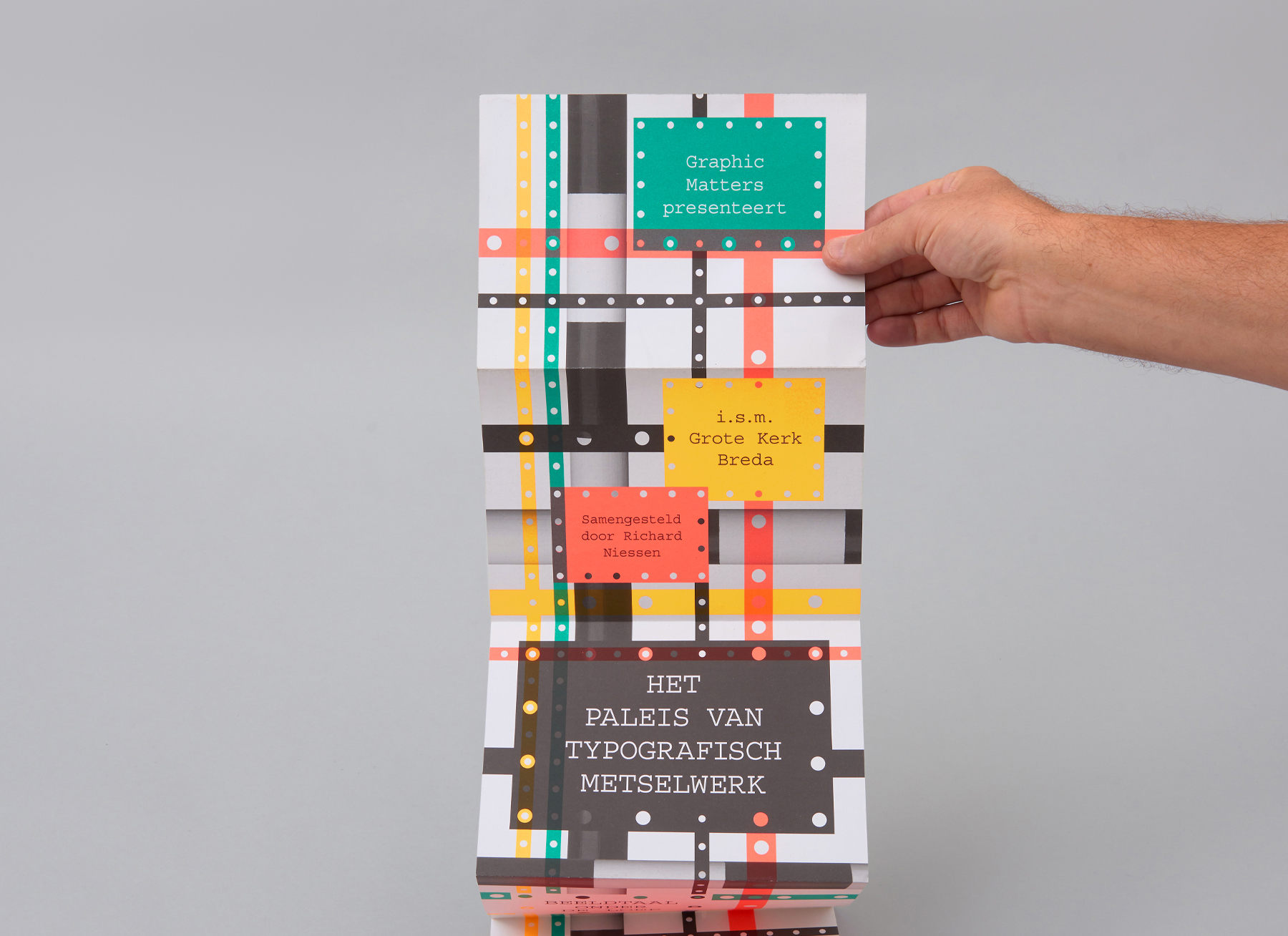 The physically sent invitation was a very elongated and seven times folded sheet. This way, all the information could be spread across the different graphic building elements.