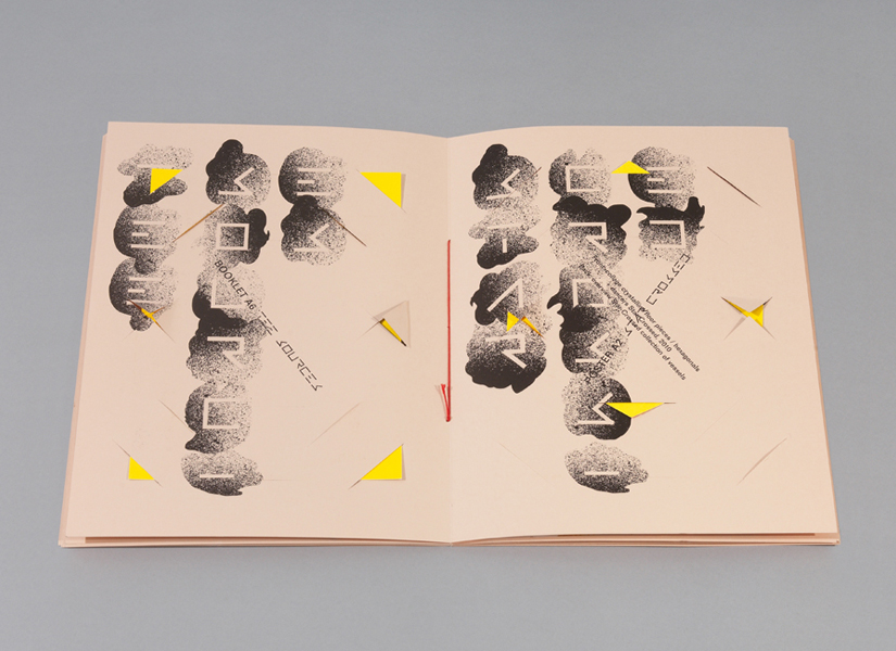 When you take out all the elements the die cutted host booklet shows all the titles of the works printed in balck on the chamois-coloured paper.