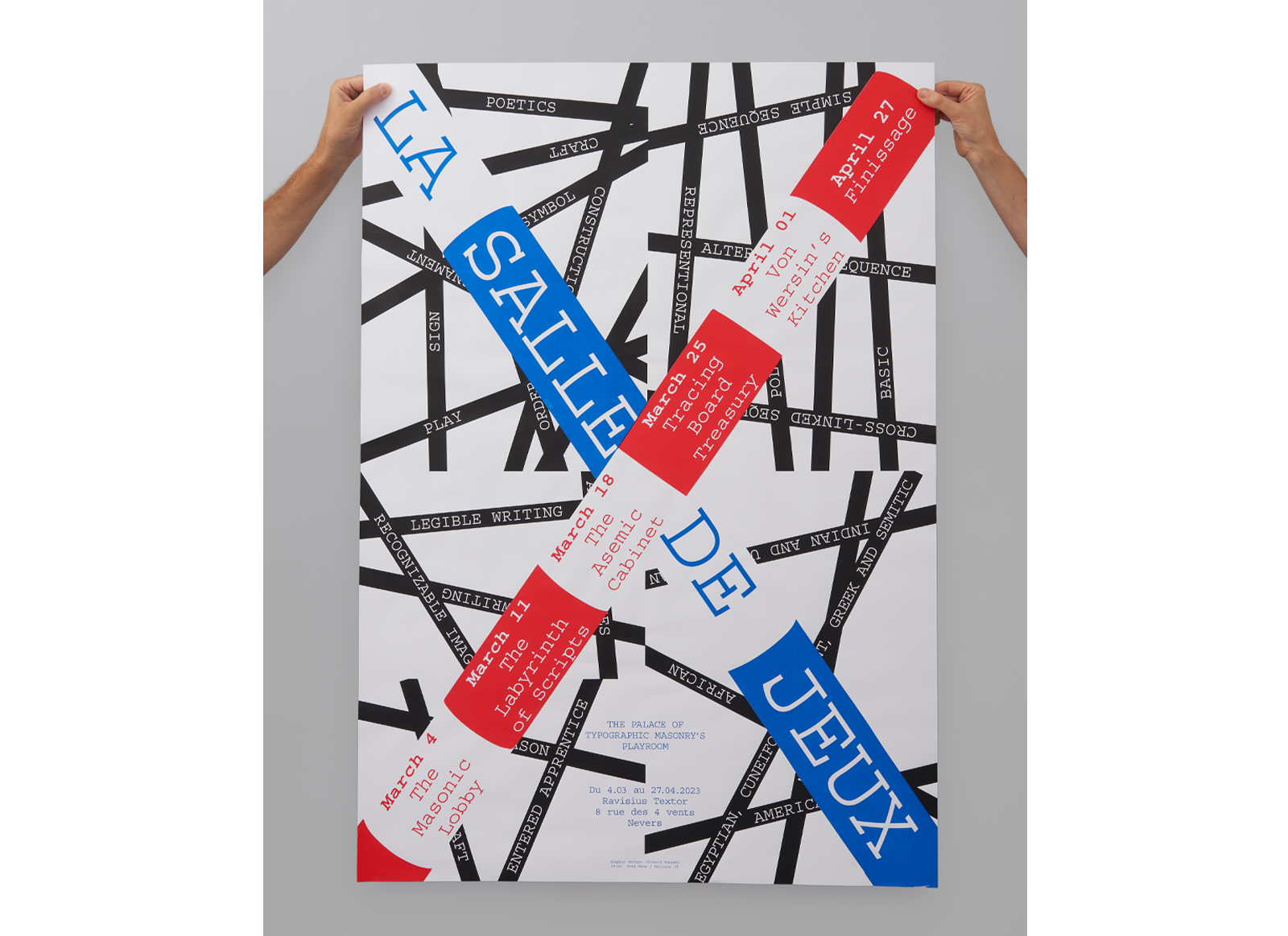 | spring:Ravisius Textor is the name of a small space, located in the historic centre of Nevers (France), where exhibitions, workshops and conferences are organised around a bookshop specialising in graphic design. Spring 2023 the place was transformed into the ‘Palace of Typographic Masonry’s Playroom’. The design of the poster plays with the read, white and blue of the French and Dutch flags and the play of lines of the subjects and themes connected to the game-like boxes on display. |