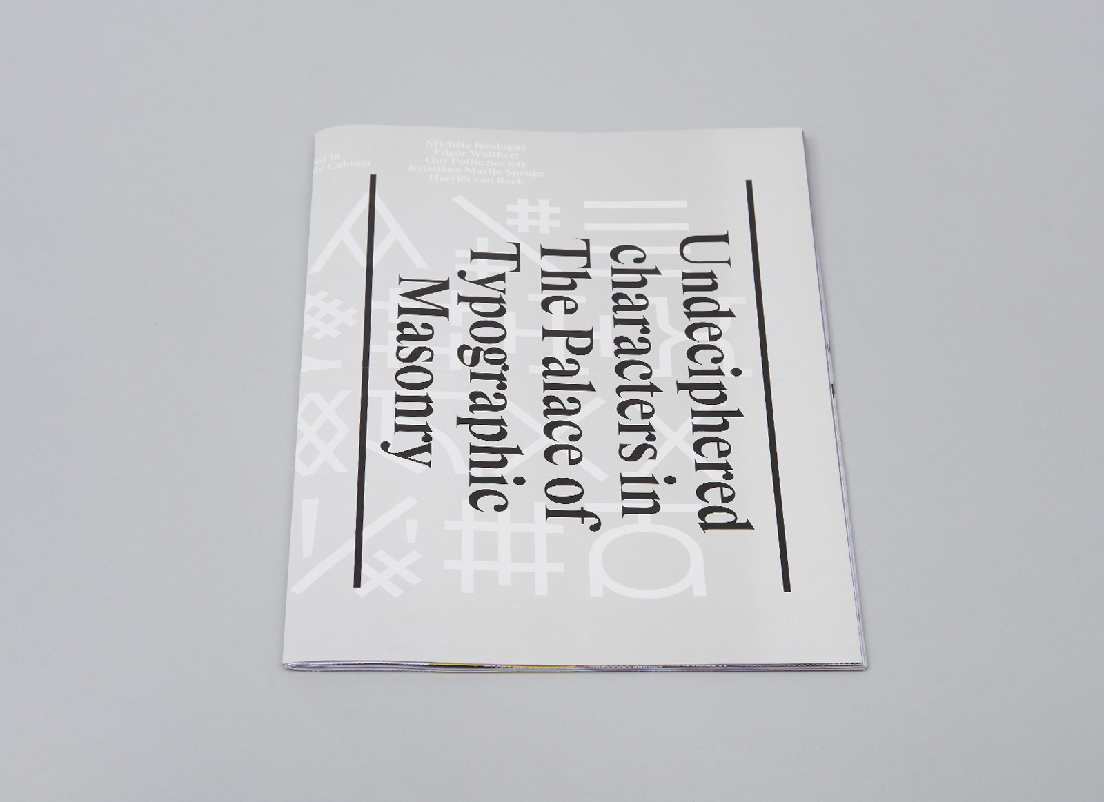 This publication brings together five contributions to The Palace of Typographic Masonry, those made by Our Polite Society, Michèle Boulogne, Kristiana Sproge, Harriet van Reek and Edgar Walthert on request of Richard Niessen.